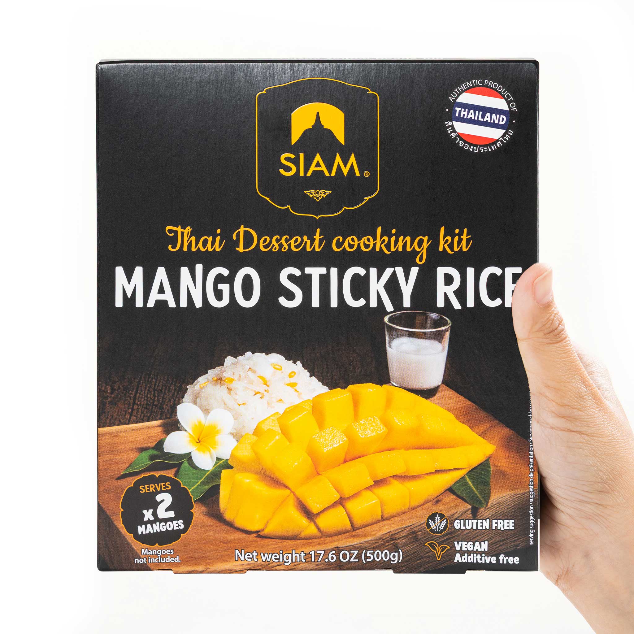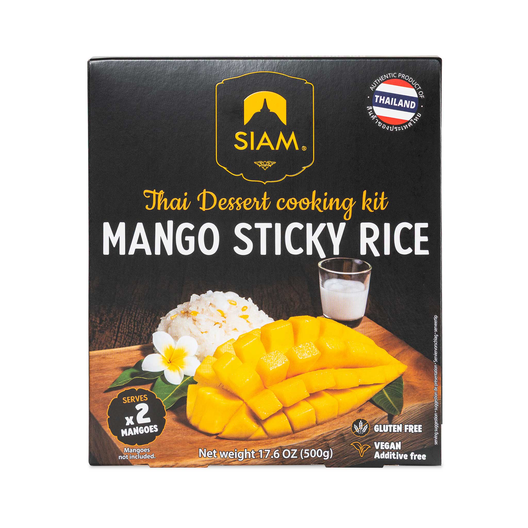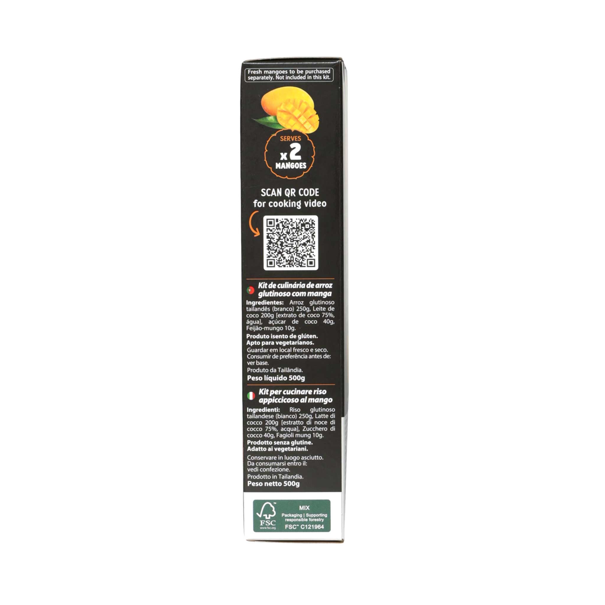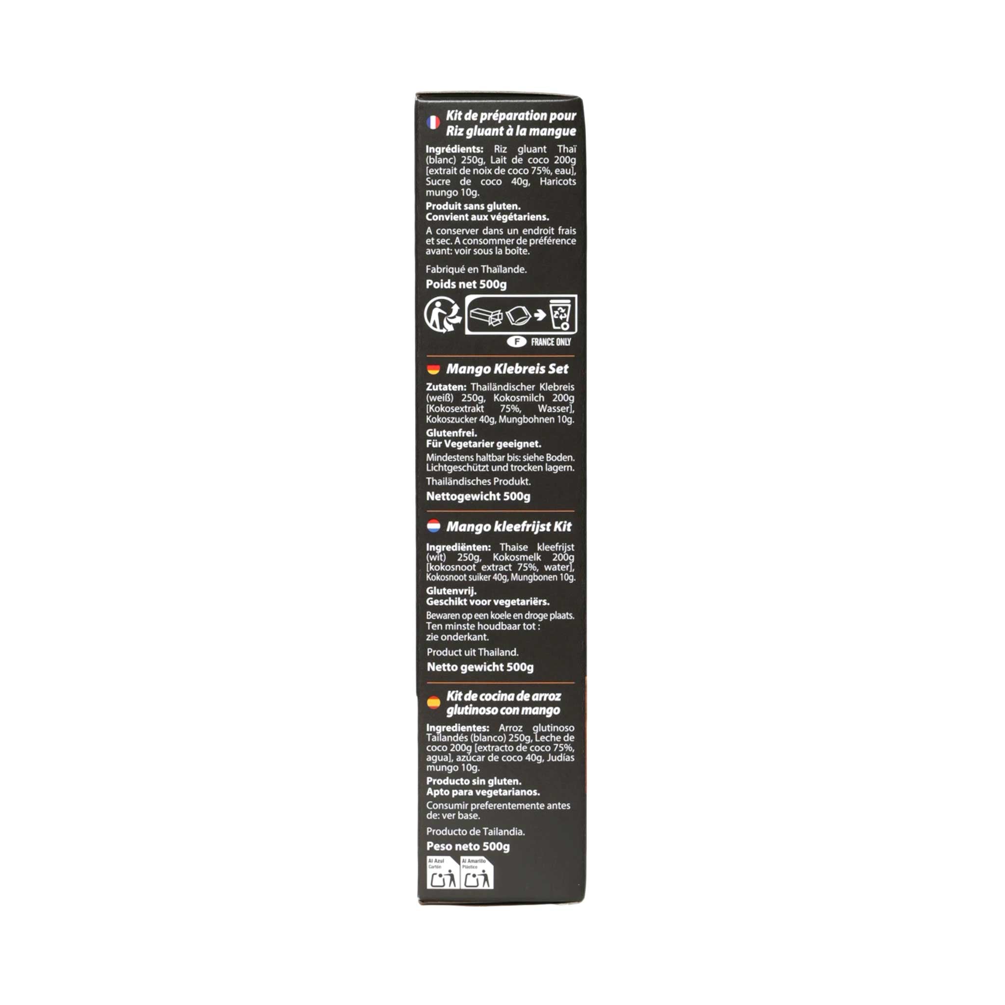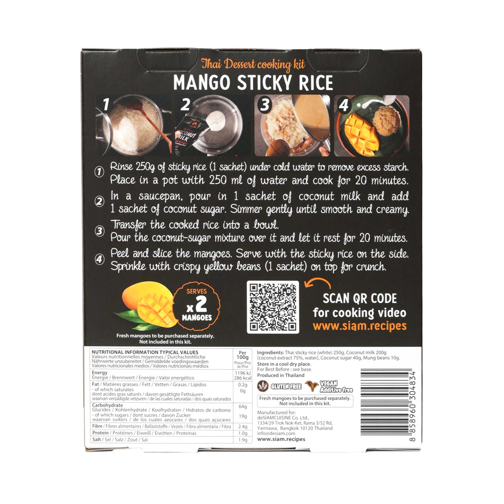 Ingredientes: Arroz pegajoso tailandés (blanco) 250 g, leche de coco 200 g [extracto de coco (coco, agua) 75,00%, agua], azúcar de coco 40 g, judías mungo 10 g.